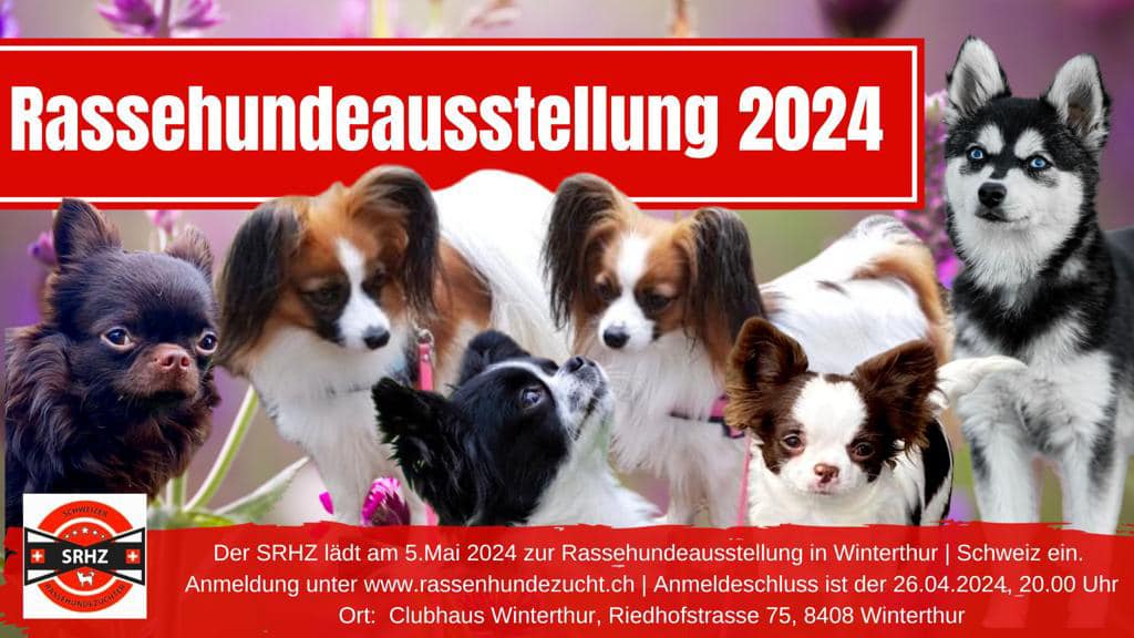 Der SRHZ lädt am 5. Mai 2024 zur Rassehundeausstellung in Winterthur/ Schweiz ein. Es sind alle Hunde und ihre Halter ❤️-lich Willkommen.